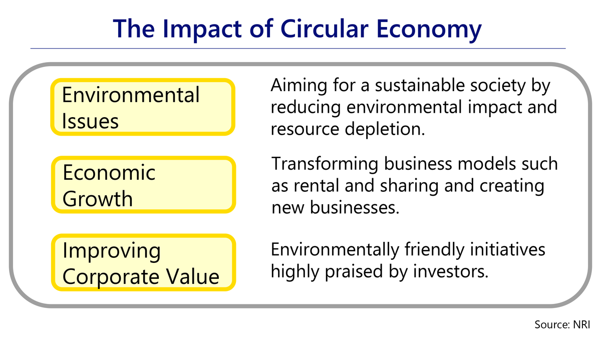 Circular Economy is an economic activity that reduces resource input and consumption, makes effective use of existing resources and products, and creates new value through services, in addition to 3Rs of "Reduce", "Reuse", and "Recycle". Circular Economy aims to create a sustainable society.