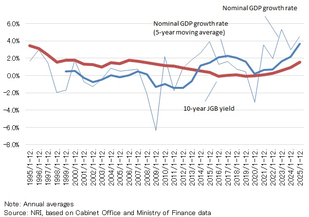Another reason is the historic surge in prices observed since 2022. When the inflation rate picks up, the nominal GDP growth rate also rises. But if financial markets regard the inflation overshoot as a temporary phenomenon, the upside for nominal long-term interest rates—such as the 10-year JGB yield—tends to be limited.