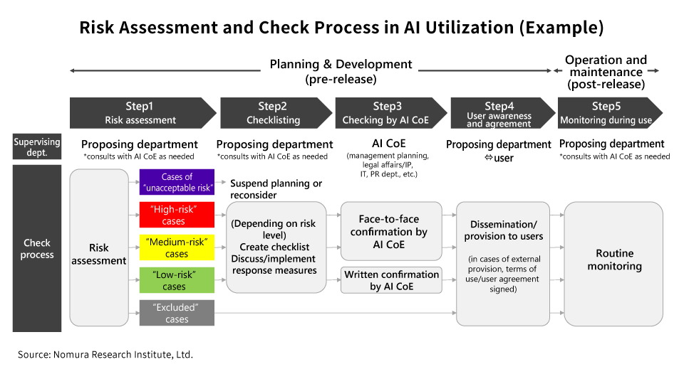 Takagi : The important thing is for management to decide on baseline premises not simply for restricting the use of AI, but for using it safely and securely. To that end, the first thing is to classify the risks according to work operations and applications. For instance, this could mean classifying anything that directly controls factory lines or social infrastructure as high-risk, anything related to sharing information with the public as medium-risk, and anything involving the efficiency of internal office operations like preparing meeting minutes as low-risk. Then, they have to set degrees of risk tolerance to specify how far the risks at each of those levels can be tolerated (e.g., acceptable limits, essential checks and approvals, oversight and monitoring standards). This isn’t an individual determination to be made on the spot; it’s a kind of decision-making for which management is responsible. Senior management has to be committed to drawing these lines, or else governance will ultimately be a mere formality.