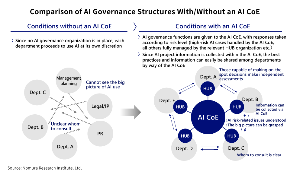 NRI members Daisuke Takagi and Misuzu Takahashi, who specialize in helping clients build AI governance structures, suggest that management must take the lead in creating organizations such as an “AI Center of Excellence (CoE)”, and must shift to an “aggressive governance” that strikes the right balance between AI promotion and control.