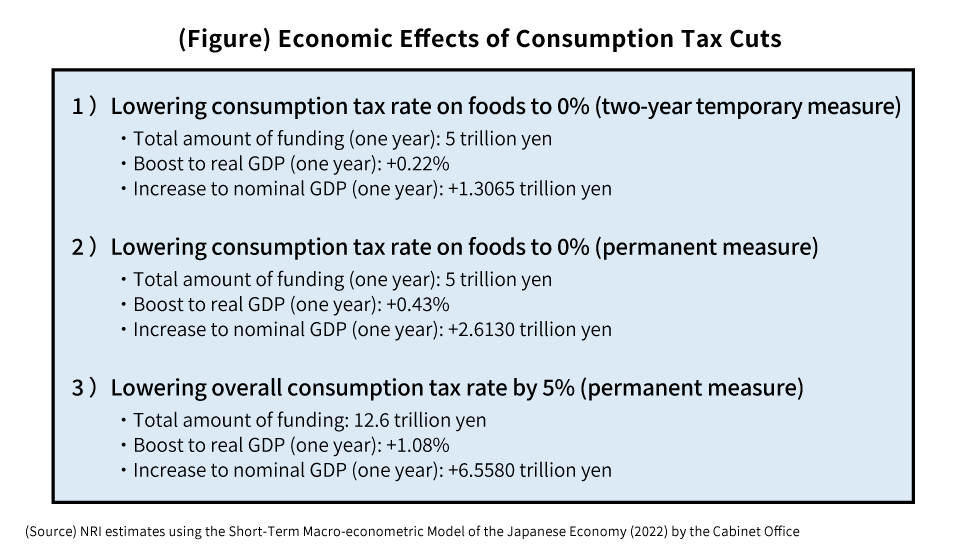 However, according to my estimates, the LDP’s proposal to eliminate the consumption tax rate on foods for two years would boost real GDP by 0.22% in a year, which is a small effect (see figure). Even if the consumption tax rate on foods were to be eliminated permanently, or the consumption tax rate overall were to be lowered, the boost to GDP would not be significant by any means. And in any of these scenarios, from the second year onward, the cuts would have hardly any effect on the real GDP growth rate.