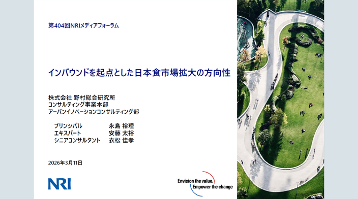 本フォーラムでは、訪日外国人へのアンケート調査をもとに、日本滞在中と現地国での日本食消費動向を分析し、さらに2030年の市場規模を推計しました。加えて、現状の課題を踏まえ、インバウンドをより効果的に活用し日本食の国際的プレゼンスを高めるための戦略的方向性を提案します。