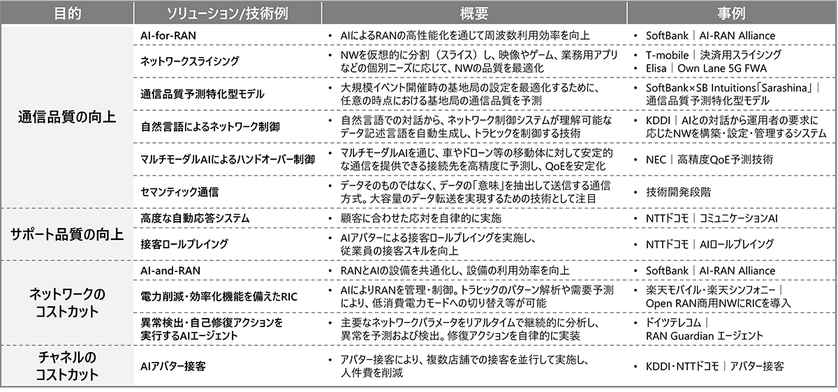図2 通信キャリアで導入されているAIソリューションおよび技術