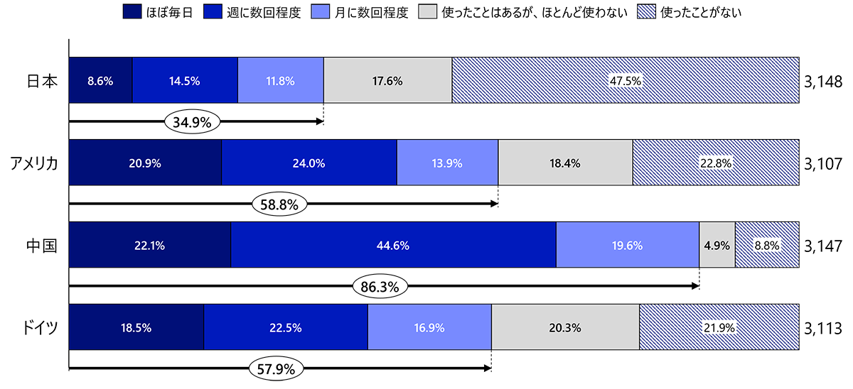 有料版のサービス利用率も国ごとの差が大きい。中国では65%が有料版を利用しており、アメリカは39%、ドイツは32%、日本は15%で最も低い。中国における有料版の利用の高さには、国外サービスへのアクセス制限が影響していると言われる。まず、ChatGPTなど海外の無料版に中国本土からアクセスしづらい事情がある。また、中国の大手(Baidu、Alibaba、ByteDance、iFlytekなど)は無料版の利用範囲を意図的に絞り、速度、トークン量、先進機能などで有料版を明確に優位化している。無料版では業務利用に耐えにくい仕様が多いため、結果として有料版の利用比率が高くなる構図となっている。一方、日本は企業におけるAI導入の判断や情報セキュリティの審査に時間がかかることが一般的であり、費用対効果の面で導入判断の厳しさなどが重なり、有料版の普及が遅れている。また無料版でも日常的な問い合わせや要約には十分という認識があることも、有料版利用率が低いことにつながっている。