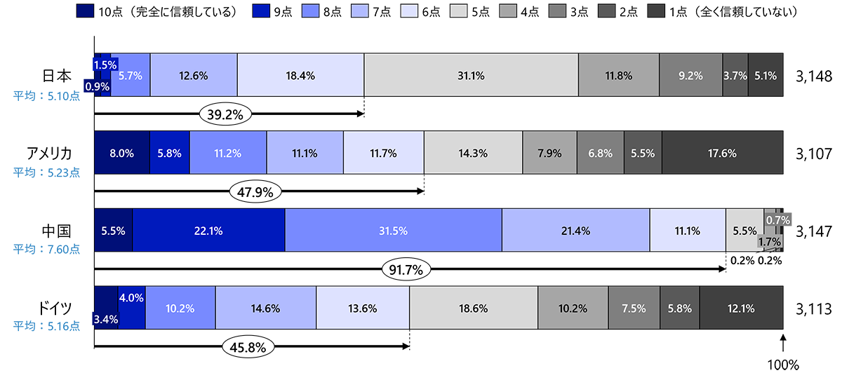 規制の面では、アメリカではAI開発は基本的に"自由競争"が前提であり、OpenAIやAnthropicなど、多くの生成AIスタートアップが台頭しており、政府の関与は最小限に抑えられている。一方で、2023年にはバイデン政権が「AIに関する大統領令」を出し、"セキュリティ・倫理・差別"などに対する自主ガイドラインの強化を促している。また、EU(ドイツ含む)では2024年に「欧州(EU)AI規制法」が可決され、世界で初めて包括的なAI法が誕生した。この法律では利用用途ごとにリスクを評価するスタイルをとっている。例えば、医療や公共インフラは高リスクと判断し厳格に規制、画像生成など創作系は中リスクと判断し柔軟に運用することとしている。迷惑フィルターやチャットボットなどは低リスクとして制限なく使用できるとして整理されている。しかし、AI利用に対するガイドラインや規制が整っていても、例えばアメリカでは2024年の大統領選挙などを通じて、AIで作成されたディープフェイク画像や音声、偽情報が氾濫したことからも、AI利用の実態は個人の使い方に依存し、そのことからアメリカやドイツではAIへの信頼度が低い人が一定数存在するものと想定される。