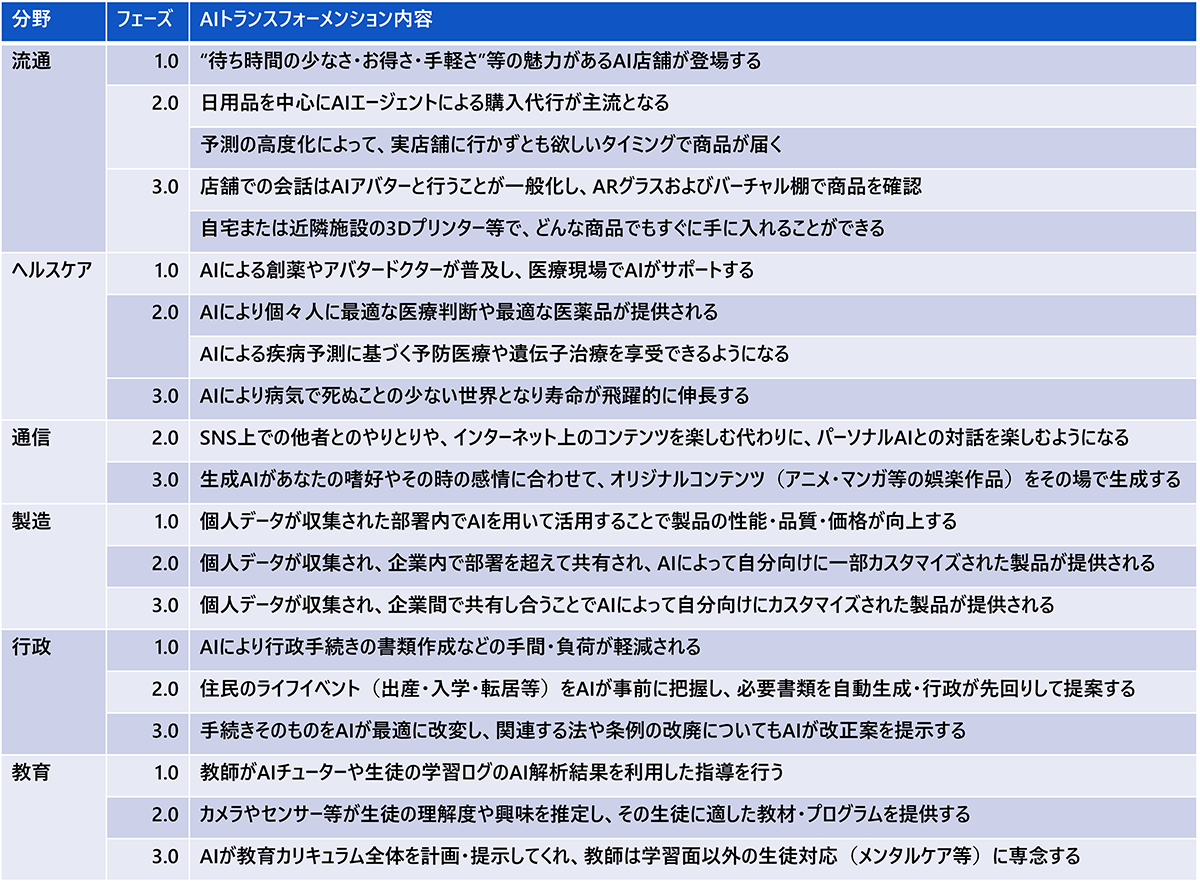 図3 各産業分野におけるフェーズ別のAIトランスフォーメーション内容