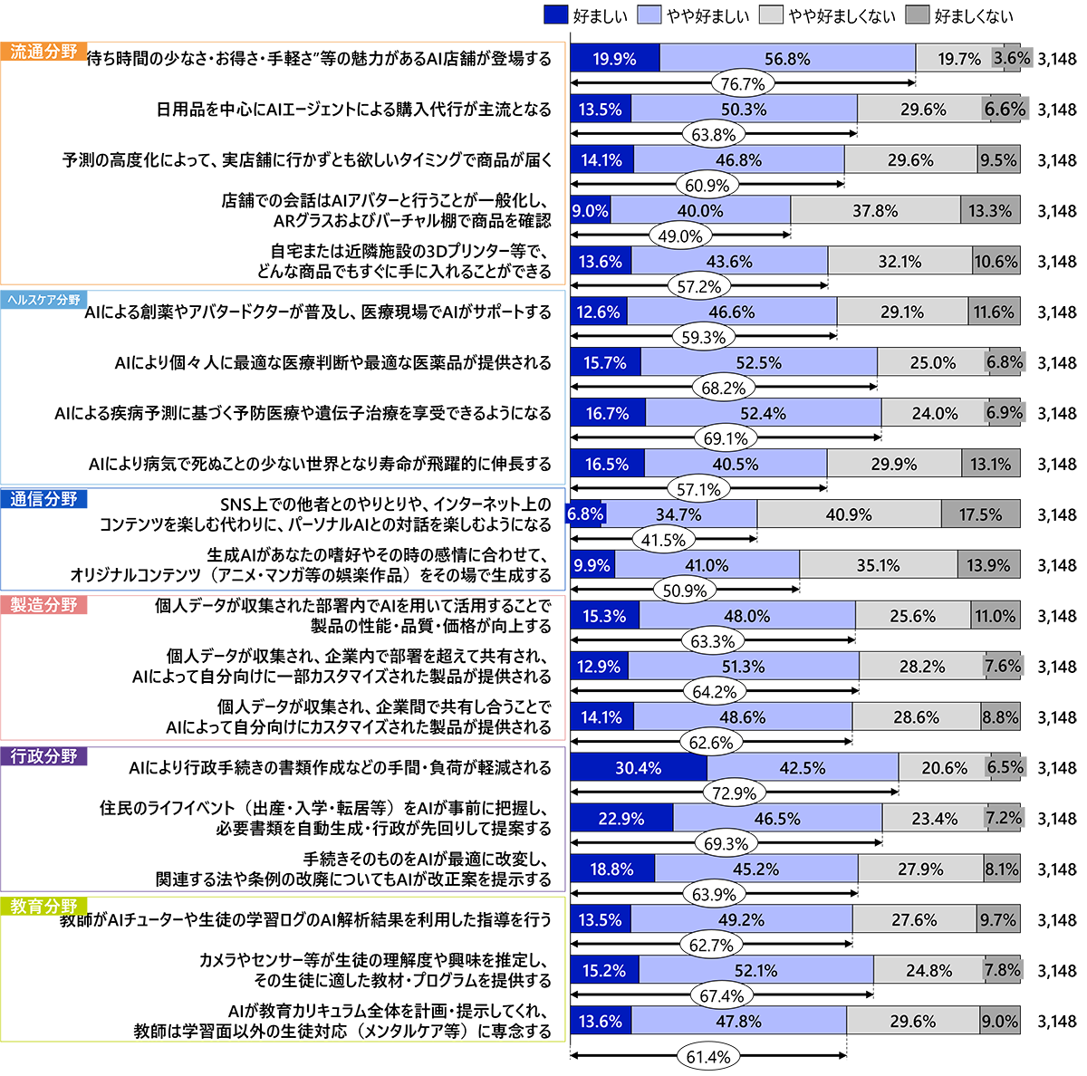本稿では「AI受容性」を、各産業分野のAI化フェーズの内容に対して「好ましい」「やや好ましい」「やや好ましくない」「好ましくない」に分け、前者2つの割合が高い場合は「AI受容性を高い」とし、後者2つの割合が高い場合には「AI受容性が低い」とする。