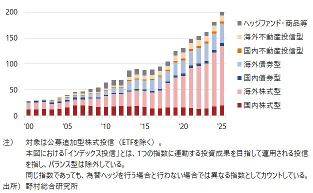 (注)野村総合研究所の集計によると、2025年末時点で公募追加型株式投信(ETFを除く)の純資産残高174兆923億円に対し、パッシブ投信の純資産残高は72兆3,636億円となり、その割合は41.6%を占めている。なお、この割合は2025年8月に初めて40%に達した。