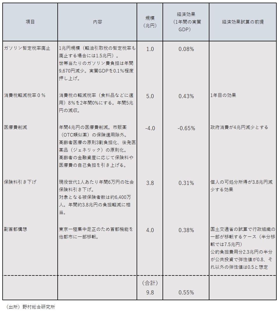 最後に、日本維新の会が掲げる主な政策の規模と経済効果についての試算を示す。