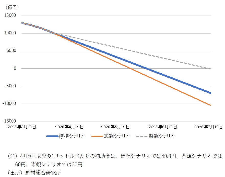 その場合、ガソリン補助金の予算が枯渇するタイミングは、標準シナリオでは6月9日、悲観シナリオでは5月29日、楽観シナリオでは7月19日となった(図表)。