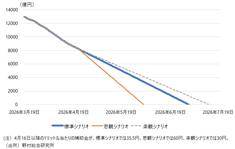 現在のガソリン補助金の予算が枯渇するのは、それぞれ「標準シナリオ」で7月1日、「悲観シナリオ」で6月3日、「楽観シナリオ」で7月14日となる(図表)。