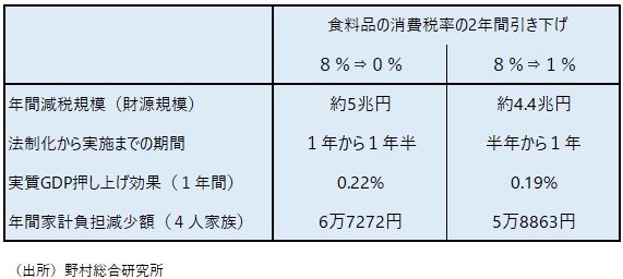 以下では、食料品の消費税率を0%に引き下げる場合と1%に引き下げる場合の、経済効果などについて比較したい(図表1)。