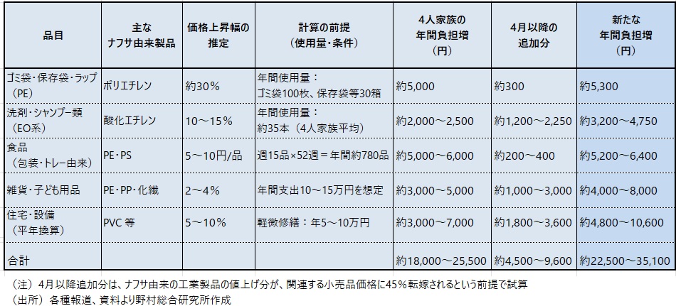 図表2 ナフサ由来の日用品の価格上昇と家計負担の試算