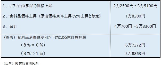 食料品の消費税率引き下げによる家計負担の減少額は、0%の場合には6万7272円、1%の場合には5万8863円と計算された。前者の家計負担増加額は後者の家計負担減少額を下回り、食料品の消費税率引き下げによって、原油価格高騰による物価高の家計への打撃は相殺される計算となる。