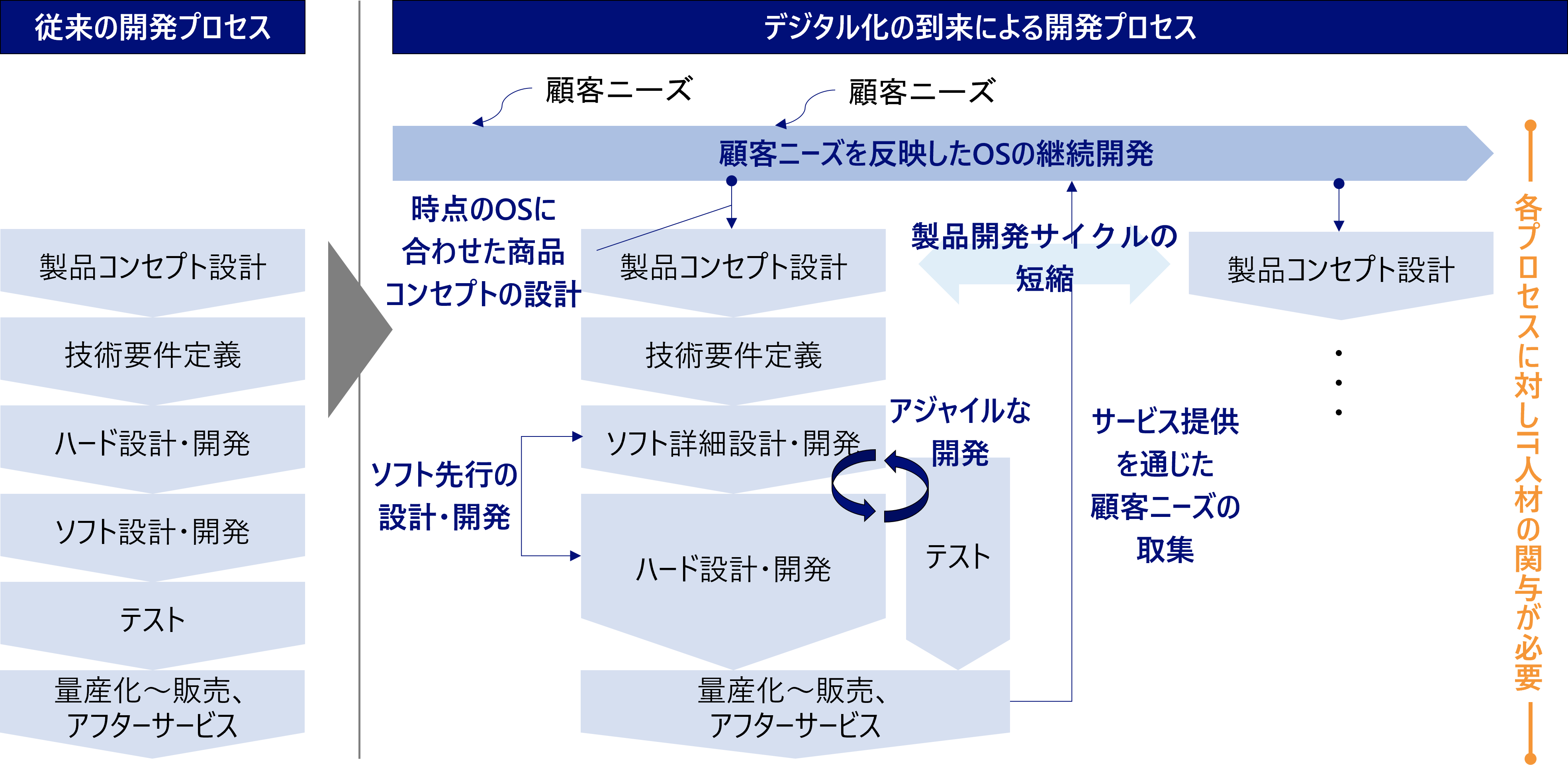 2024年5月に経済産業省が発表したモビリティDX戦略にも記載があるように、製品開発はデジタル化により新たな競争環境を迎えている。特に図1に示すように、ハード起点の設計・開発を実施し、ハードを制御するためのソフトが合わせて設計・開発されていた従来の製品開発プロセスは、デジタル化の到来により大きく変容した。サービス提供を通じた顧客ニーズ収集がデジタル化され、より顧客起点の製品開発が実現できるようになる中で、製品設計もソフトウェア起点に展開され、ソフトウェアに合わせたハードウェアが開発されるようになっている。結果として、プロセス全体においてIT人材の重要性が高まっている。