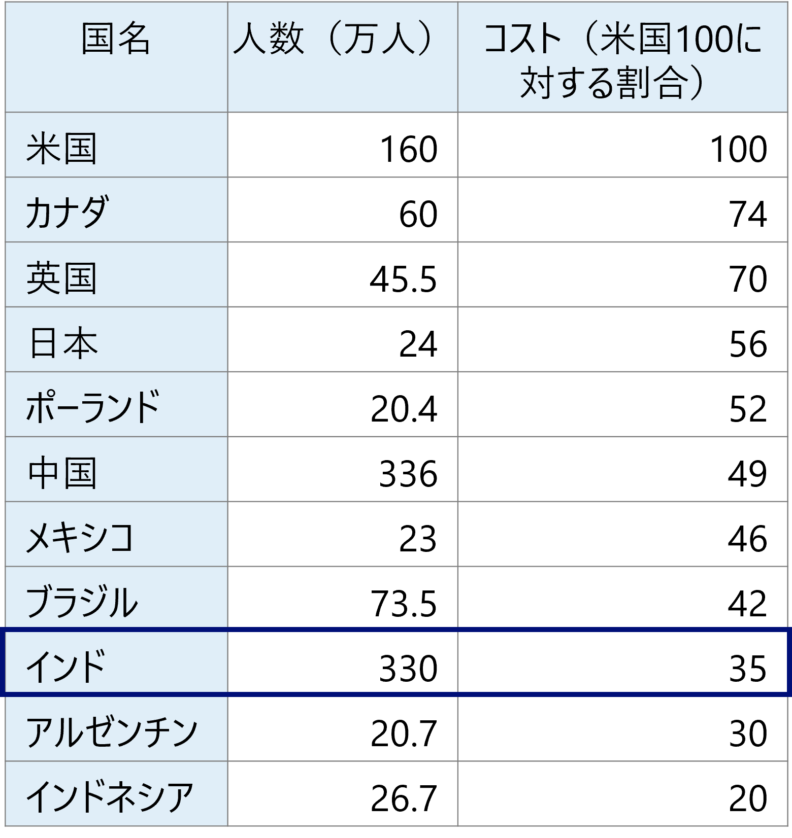主要国の中で特にIT人材が豊富であり、またAI領域における人材集積も進んでいるインドは、製品開発拠点先として注目されている。図2に示すように、インドのIT人材数は主要国の中で中国の次に多く、かつコストは中国の約7割の水準である。