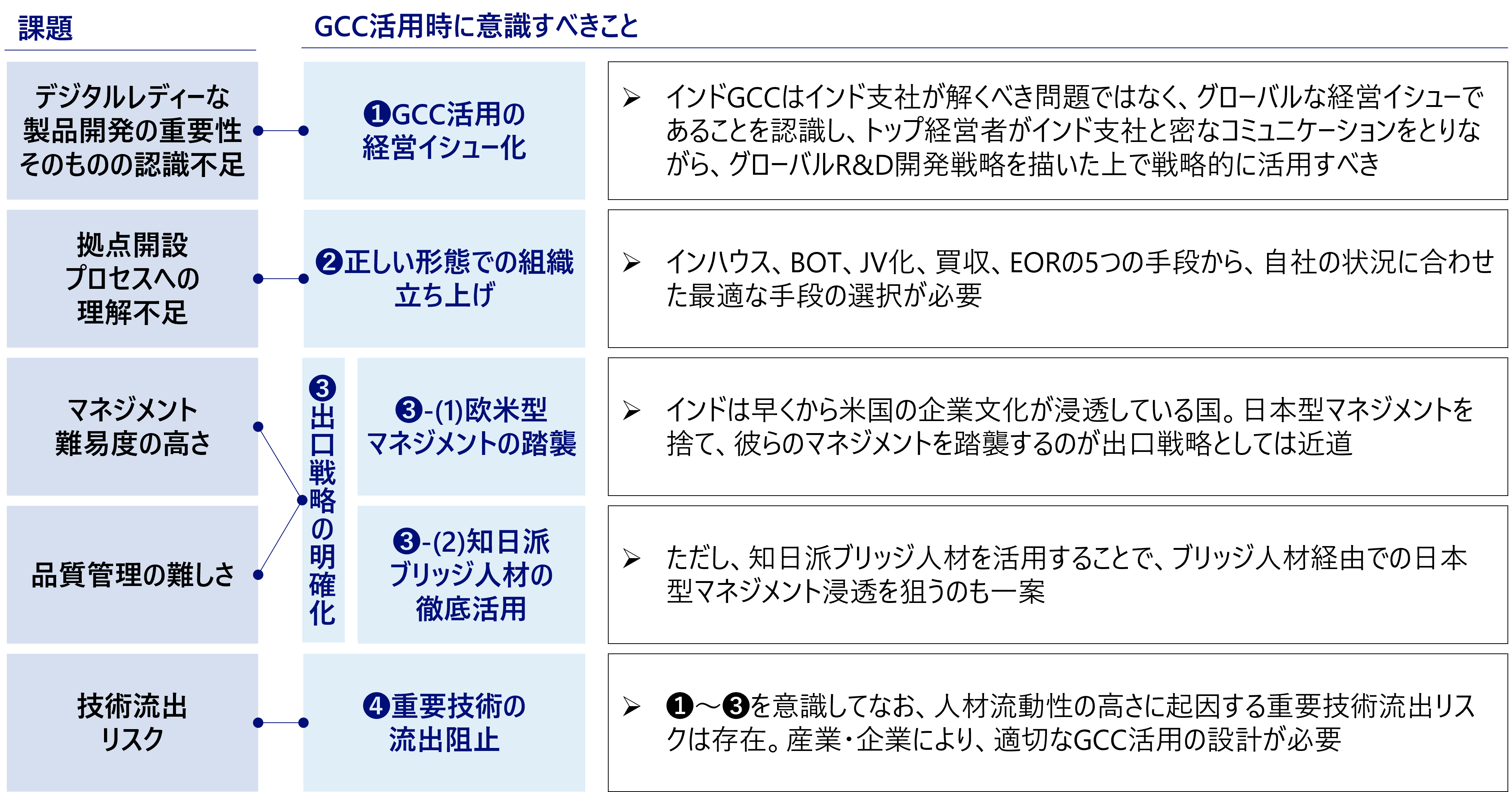 他方、GCCを活用する多くは製造業であり、製造業におけるハード寄りの開発などでは日本企業特有の慣習や既存のマネジメント方法が適しているため、日本型マネジメントによる開発の方がなじむ場合も存在する。日本型マネジメントスタイルを浸透させたい場合は、知日派インド人材を中核人材として登用し、知日派人材経由でマネジメントスタイルを浸透させていくことで成功する事例がある。ただし、知日派インド人材の発掘は現時点では難易度が高いのが実情であり、積極的な日本での研修実施等、社内教育の地道な取り組みも重要となる。