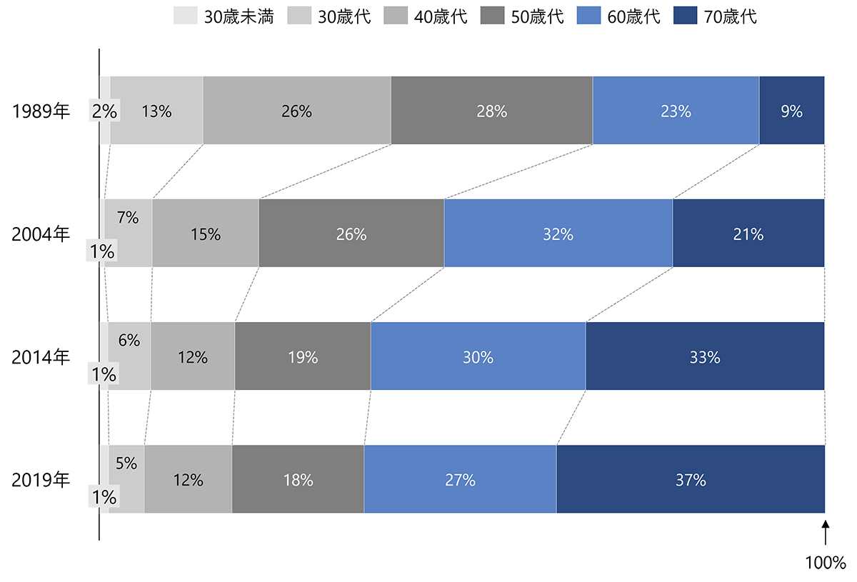 資産構造の偏在も、ニーズをさらに複雑にさせている。日本の家計金融資産は約2,200兆円に達し、その相当割合を65歳以上の高齢世代が保有しているという現状がある(図表6)。近年は高齢層同士の相続(いわゆる老老相続)が進行し、資産が高齢世代内で留まる傾向も強まっている。老老相続や資産偏在のもとで、貯蓄や不動産などの「ストック」を基盤に生活・消費を行う高齢者層が存在する一方、共働き世代は月々の収入や可処分所得といった「フロー」を軸にした消費パターンで暮らしているという世代間の違いが明瞭になっている。したがって、高齢者の貯蓄をどのように自社サービスの消費に繋げていくのかといった新たな事業領域の拡大・商品開発の必要性も生まれる。