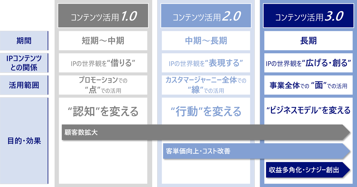 事業運営におけるIPコンテンツ(知的財産を基盤に展開されるマンガ、アニメ、音楽などのコンテンツ:以下コンテンツ)の活用が拡大している。単に商品・サービスの認知拡大を目的とした活用(コンテンツ活用1.0)から、顧客の行動変化やそれによる単価向上を目的とした活用(コンテンツ活用2.0)、さらには新規事業の創出を目的とした活用(コンテンツ活用3.0)に至るまで多様化しており、コンテンツを活用した事業運営の高度化や事業創造は、幅広い業界のプレイヤーにとって無視できない潮流となっている。