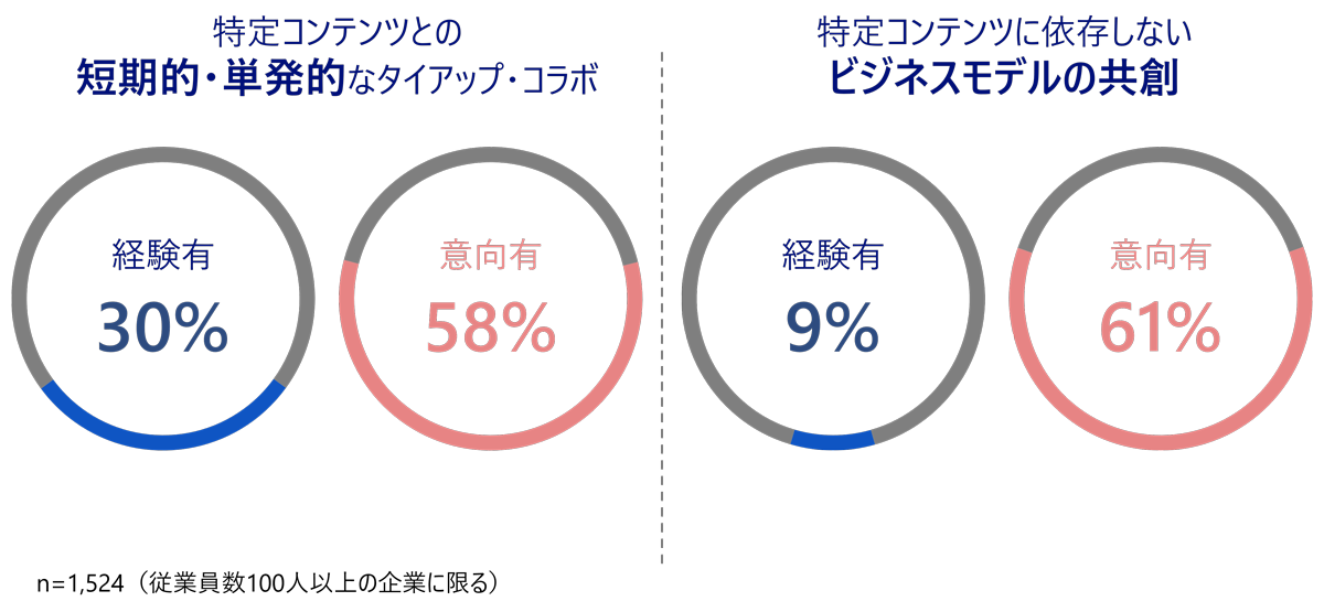 これらの市場ポテンシャルは、既存のコンテンツ事業者はもちろん、非コンテンツ事業者にとっても非常に魅力的な成長機会となり得る。NRIが2025年7月に実施したアンケート結果からも、コンテンツ事業者との協業に対する企業の関心度の高さが明らかになっている(※8)。しかし、多くの企業がコンテンツ活用の可能性を認識し今後の連携を模索している一方で、実際に協業を実践している企業は依然として少数にとどまり、高度なコンテンツ活用ほどその傾向は顕著である。今後は、協業意向の高まりと、実際の経験値の間に存在する大きなギャップをいかに埋めていくかが非コンテンツ産業におけるコンテンツ活用の論点となるだろう。