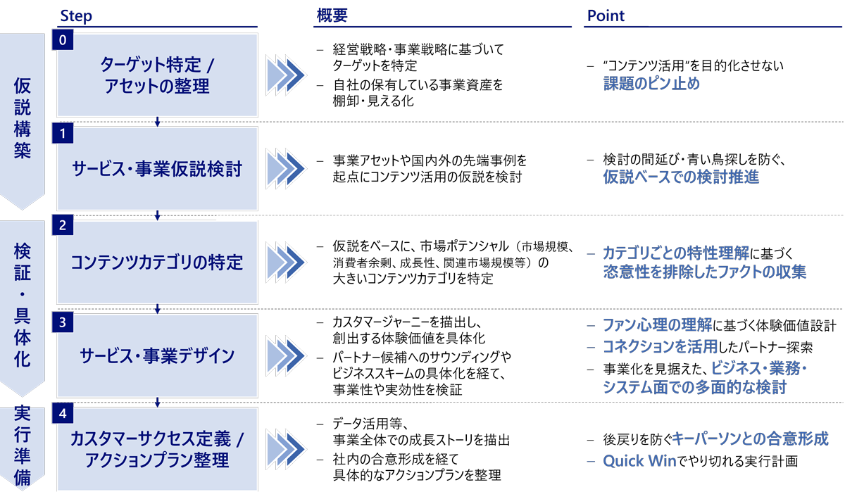 その第一歩として、自社が持つ有形・無形のアセットを棚卸し、親和性の高いコンテンツ領域やコンテンツ活用の類型を見定める必要がある。そのうえで、ターゲットとなる顧客やファンの心理・行動特性を把握し、それらを起点にサービスやビジネスをデザインすること、また、そこで得られた顧客接点やデータをどのように事業運営へ活かしていくのか具体的に設計することが肝要となる。
