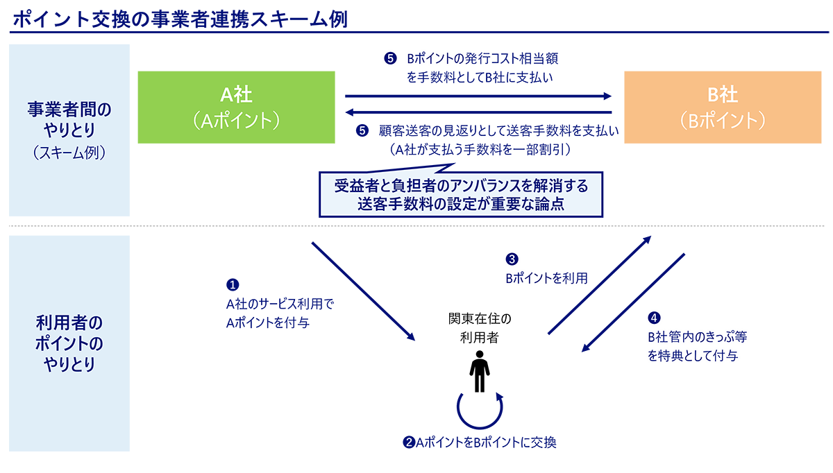 その実現の課題は、ポイント特典の売上配分やコスト負担の仕組みの構築にある。一般的なポイント交換では、ポイントの交換元が交換先にポイント発行コスト相当額を支払う仕組みになっている。しかし、「移動」に関しては主要都市にアクセスできる路線に特典の利用が集中し、鉄道会社間でコスト負担の不公平感が生じることが懸念される。例えばJR東日本とJR東海がポイント交換で連携する場合を想定すると、JR東日本のJRE POINTを貯めている関東在住の利用者がポイントでJR東海の東海道新幹線を利用して大阪旅行に行けることなる。この場合JR東日本は、自社負担で流通させているポイントが交換先のJR東海に流出し、ポイント発行相当額を負担することになりキャッシュアウトとなる。第5回で述べたように、自社サービスや加盟店での利用に対して、高い還元率で顧客の囲い込みを行っていた鉄道各社においては流出ンパクトは大きいため、JR東日本はJR東海へ送客した見返りとして手数料を一部割引してもらう、等の各社間で納得感のあるポイント交換スキームの構築が課題となる。一方で、JR東日本には、大阪に旅行したい関東圏の消費者がJRE POINTを貯めるためにJR東日本のサービスを利用するといった新規顧客獲得や利用単価・頻度の向上の効果が期待されるため、ポイント交換時の事業者間のやりとり比率である送客手数料の水準はデータに基づいた適切な設定が必要である。また、予想外のキャッシュアウトが発生した際、片方に過度な不利益が生じないように利用状況に応じて送客手数料をフレキシブルに変えるなどの運用上の仕組み、工夫も必要不可欠となる。将来的には、航空会社との連携により移動の選択肢を国外へ大幅に拡張し、真の「移動」経済圏を提供することが出来れば、経済圏としてより強固なものになる。その際は鉄道・航空各社の競争領域と連携領域を見極め、踏み込んだ連携スキームの検討が必要になる(図表3)。