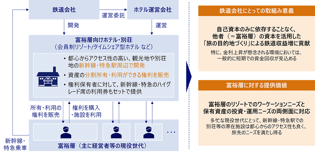 また、タイムシェア型ホテルへ富裕層が投資する事例も見られる。例えば、NOT A HOTELは北軽井沢や那須、三浦半島などのリゾート地でホテル兼別荘を開発し、年間10日間以上の物件所有権として個人に販売している。購入者は共同所有型のオーナーとなり、購入した日数分利用できるほか、ホテルとして収益化することも可能としている。2025年開業予定のみなかみの事例では、JR上越新幹線「上毛高原駅」から車で13分の立地で、別荘兼ホテルを開業しており、所有権は既に完売している。今までの鉄道会社は、「鉄道利用という単価が低いが、顧客の裾野が広い」顧客基盤を活かしてマス向け中心のサービス展開を実施してきたが、第7回(鉄道会社独自の経済圏の将来像)で提示した「鉄道経済圏を拡大するためのステータス構築」に向けて富裕層をターゲットにした商品・サービス設計が重要となる。なお、現役経営者などの富裕層にとっては、都心部とのアクセスは旅における重要な要素となる。実際に、高級リゾート「ふふ」を展開するヒューリックも、投資場所の基準を「東京から時間距離1~2時間圏内」と設定している。その観点で、中長距離の輸送ネットワークを持つ鉄道会社だからこそ、新幹線や特急駅近隣で宿泊施設に投資し、「移動と宿泊を併せたラグジュアリー体験」を提供価値として、会員権や所有権という形で収益化する事業モデルも考えられる(図表1)。