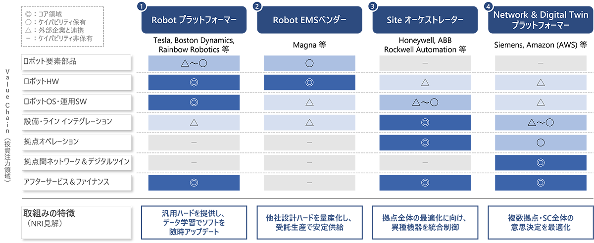 現在自動車向けの受託生産メーカーとして事業を展開するMagna等は、スタートアップ等の他社が設計したヒューマノイドやロボットを量産可能な工業製品に仕立て上げ、安定供給する製造インフラとしての立ち位置確立に向けて投資を進めている。 - ③Site オーケストレーター