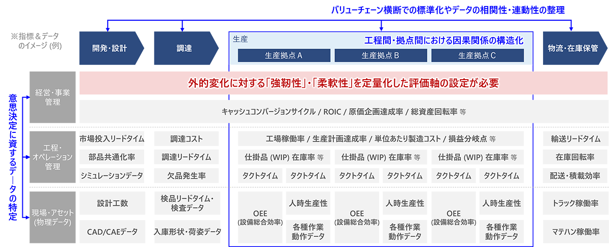 第2章で紹介したソリューション等への投資は、短期視点での効果測定は難しく、また、単一作業の代替による人件費削減だけでは回収に時間を要するケースが多い。しかし、上記のような変化への対応力を価値として評価し、拠点全体、あるいはバリューチェーン全体でのリスク低減効果を含めて投資意義を定義し直すことが、社内外からの投資への納得感を得るためのポイントとなる。