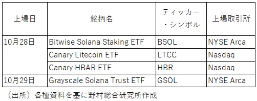 2025年10月28日から29日にかけて、米国の2つの証券取引所に4銘柄の暗号資産現物ETF(上場投資信託)が、新たに上場された(図表)。これらは、ソラナ(SOL)、ライトコイン(LTC)、ヘデラ(HBAR)といった、従来、米国の証券取引所に上場する現物ETFが組成されていなかった暗号資産を裏付け資産とするETFである。