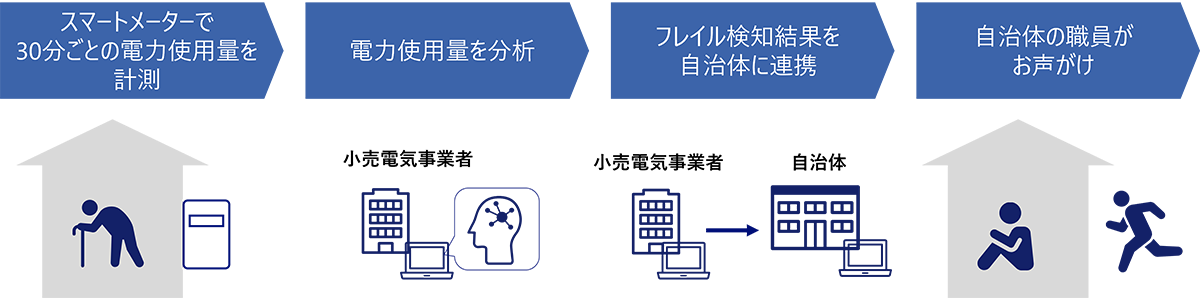 中部電力株式会社の「eフレイルナビ」(図2)では、電力使用データを分析し、フレイル(身体機能の低下)リスクの高い方を検知するサービスを提供しています。これにより、ヘルスケア分野での電力データ活用の可能性が実証されています。