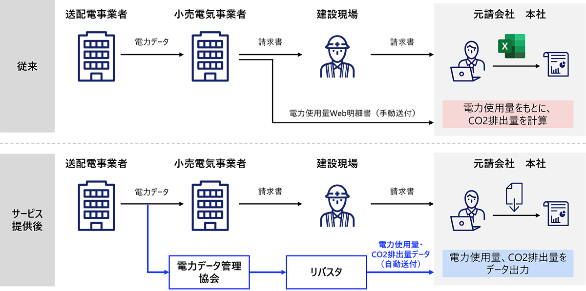 株式会社リバスタの「TansoMiru(タンソミル)電力」(図3)では、スマートメーター経由で得られた電力データを用いて、建設工事会社向けに全国の工事現場のCO2排出量算出を支援するサービスを展開しており、環境負荷測定分野での活用例を示しています。