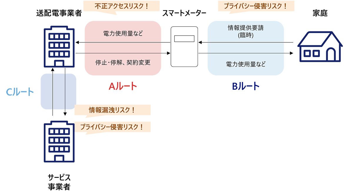 送配電事業者とスマートメーターの連携ルート(Aルート)の情報が攻撃対象となり、電力使用データが不正に取得される可能性があります。これにより、電力使用データの不正取得、料金の不正請求、電力消費の不正操作につながる恐れがあります。