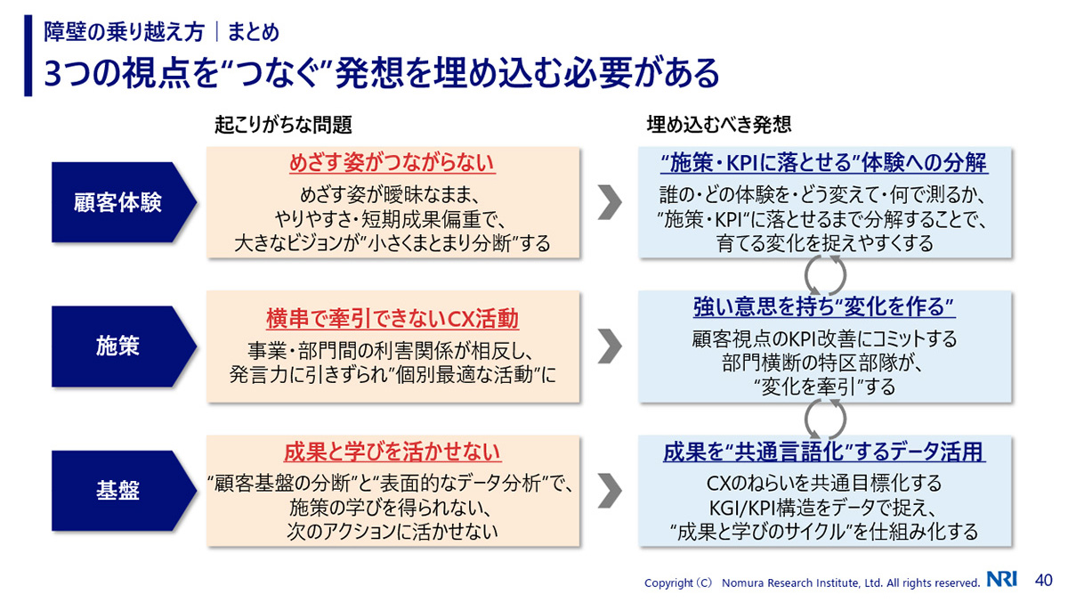 そこでNRIは、『生成AI時代を勝ち抜く顧客接点変革 ~組織横断で体験を”つなぐ”実践的アプローチ~』と題したウェビナーを開催。「顧客体験・施策・基盤」の3つを有機的につなぎ、全社統合型のCX(統合CX)を実現するための実践論を解説しました。
