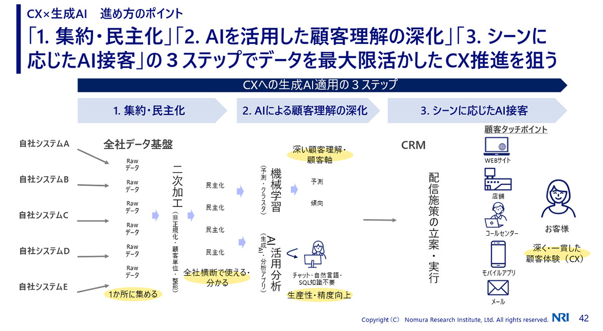 - 3.基盤をつなぐ:顧客IDやデータを統合し、AIが顧客のコンテキストを正しく理解できる環境(AI Readyなデータ基盤)を作る。