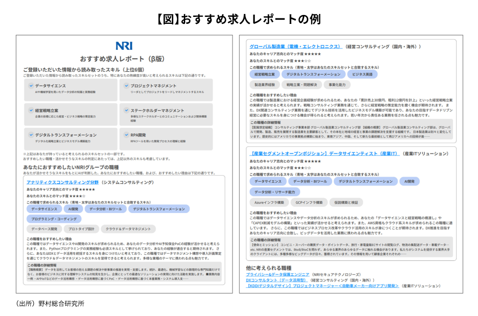 これまでは小規模な展開にとどめてきましたが、需要は着実にあると串間は感じています。利用者アンケートには「(足りないスキルについて)忖度せずに、厳しく指摘してもらって構わない」というコメントもあり、スキルの可視化は想定以上に好感されているようです。自社利用のために開発したサービスでしたが、当社と同様の課題を抱える企業から、このサービスを導入できないか、という問い合わせもいただいています。「今後はより多くの求職者に使っていただくためにプロモーションにも力を入れていく予定です。レコメンド結果を参考にするだけでなく、ユーザーの成長機会にしていただければと思っています。今は転職を考えていない人が、レポートをきっかけにキャリアを考えたり、スキルアップして、数年後にNRIに応募いただけたりすれば嬉しいです。」