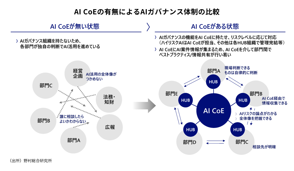 野村総合研究所(NRI)で、AIガバナンス構築を支援する高木大輔と高橋未鈴は、経営層自らが「AI CoE(センター・オブ・エクセレンス)」などの組織づくりを主導し、推進と統制を両立させる「攻めのガバナンス」への転換が必要であると提言します。