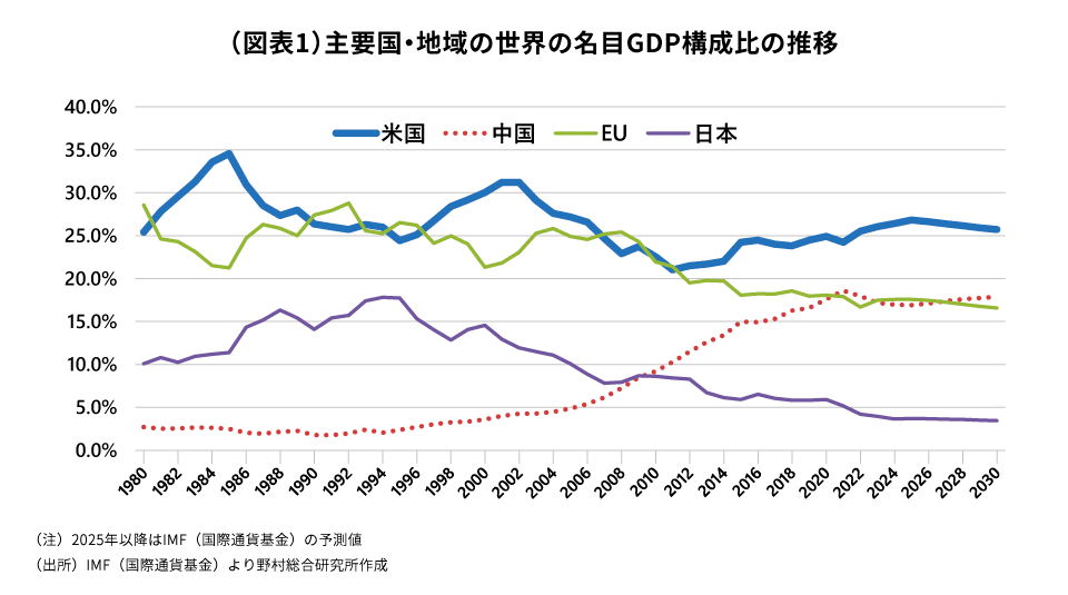 また、一時は米国のGDP(ドル建て)は中国に早晩追い抜かれることが予想され、それがドルの事実上の基軸通貨の地位を揺るがすとの見方も浮上していました。ところが、不動産不況の影響などで中国経済が成長率を大きく落としたため、米国のGDP(ドル建て)が中国に近い将来追い抜かれる可能性は低下しています(図表1)。