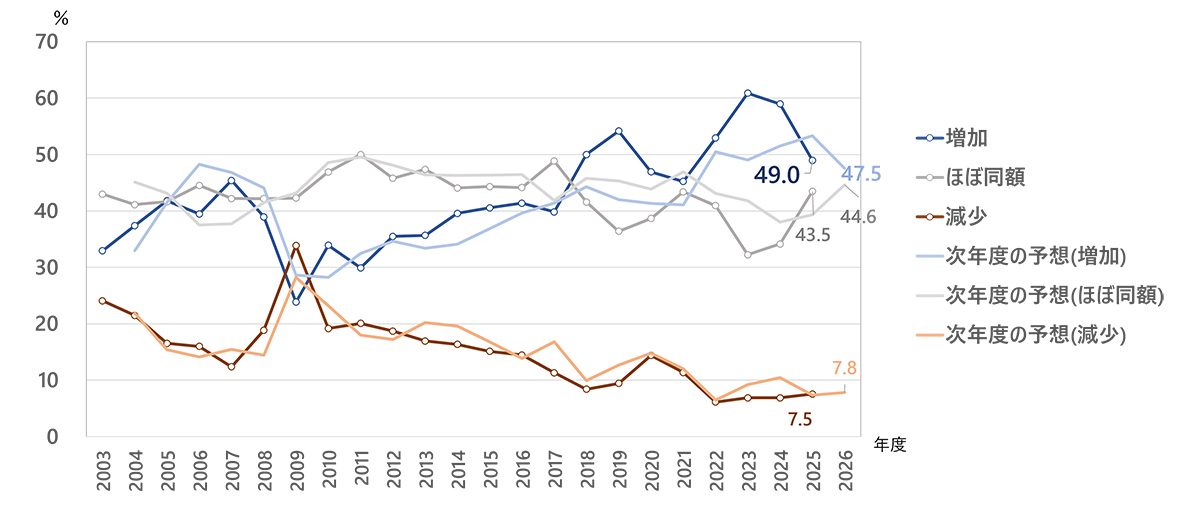 n=345(2025年度実績および2026年度予想:全回答企業数から該当設問への無回答企業を除く有効回答企業数)