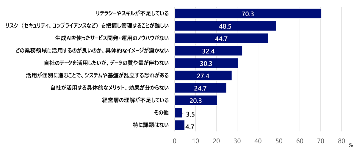 生成AIの活用に関わる課題をたずねたところ、最も多く挙げられたのは「リテラシーやスキルが不足している」で、70.3%でした(図3)。これに次いで多く挙げられたのは「リスクを把握し管理することが難しい」で、48.5%でした。