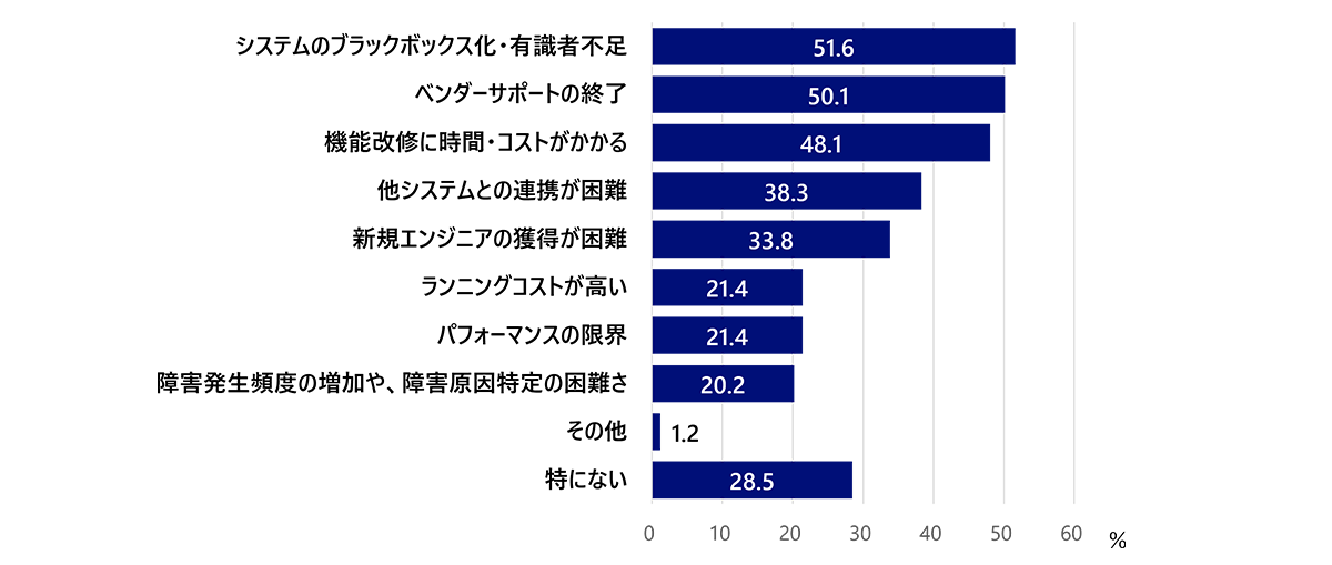 また、レガシーシステムを継続利用する際の懸念や課題についてたずねたところ、「システムのブラックボックス化や有識者の不足」を挙げた企業が51.6%、「ベンダーサポートの終了」が50.1%という結果になりました(図5)。