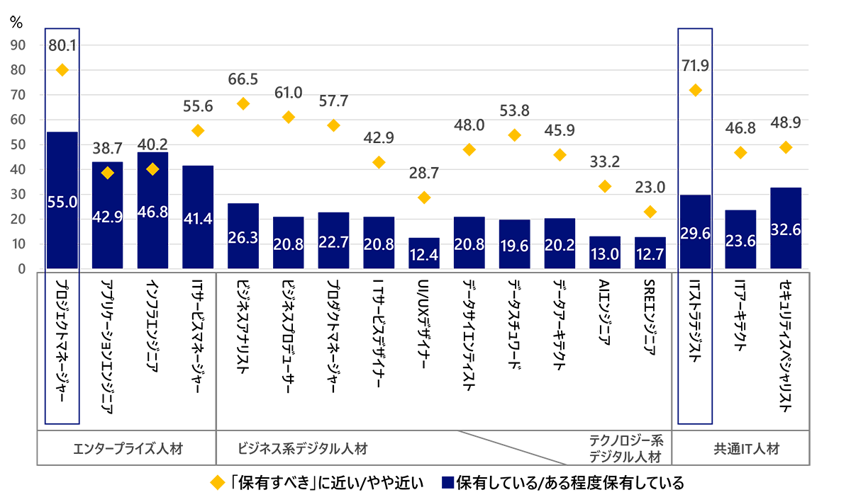 ITスキルの分野ごとに、社内・グループ内でケイパビリティを保有すべきと考えるか、およびそれらを保有しているかをたずねました。その結果、保有すべきという割合がもっとも高かったのは「プロジェクトマネージャー」で80.1%、次いで、デジタル技術を理解してそれをビジネスに活かすことができる「ITストラテジスト」で71.9%でした(図6)。一方、「ITストラテジスト」を保有していると回答した企業は29.6%で、ニーズが満たされていないことが伺えます。このようなニーズと実態の乖離傾向は、ビジネス系やテクノロジー系のデジタル人材全般で確認できます。