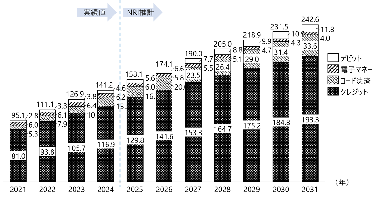 市場の拡大をけん引するのは引き続きクレジットカードで、2024年の約117兆円から2031年には約193兆円へと拡大します。タッチ決済の普及により、バスや鉄道などの交通利用や、コンビニエンスストア、スーパーなどでの少額利用の広がりが期待されるほか、B to Bでは、経費精算だけではなく、仕入れなども含めた企業間取引全般への利用拡大が大きく寄与する見込みです。