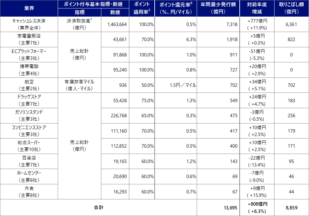 表1:国内12業界別 2024年度のポイント・マイレージ年間最少発行額と算出の根拠※