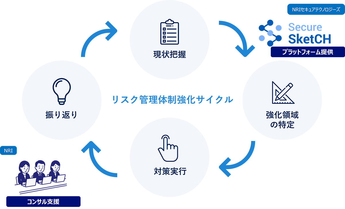 NRIでは、金融庁の「監督指針」をはじめ、金融機関に求められている各種法令やガイドラインに基づき、システムリスクに関するNRI独自のチェックリストを提供しています。本チェックリストはNRIセキュアテクノロジーズの「Secure SketCH」上で提供しており、金融機関やサードパーティの現状把握や対策検討の指針としてご活用いただけます。本サービスはこのチェックリストでの評価に基づきNRIのコンサルタントがTPRMを総合的にご支援します。