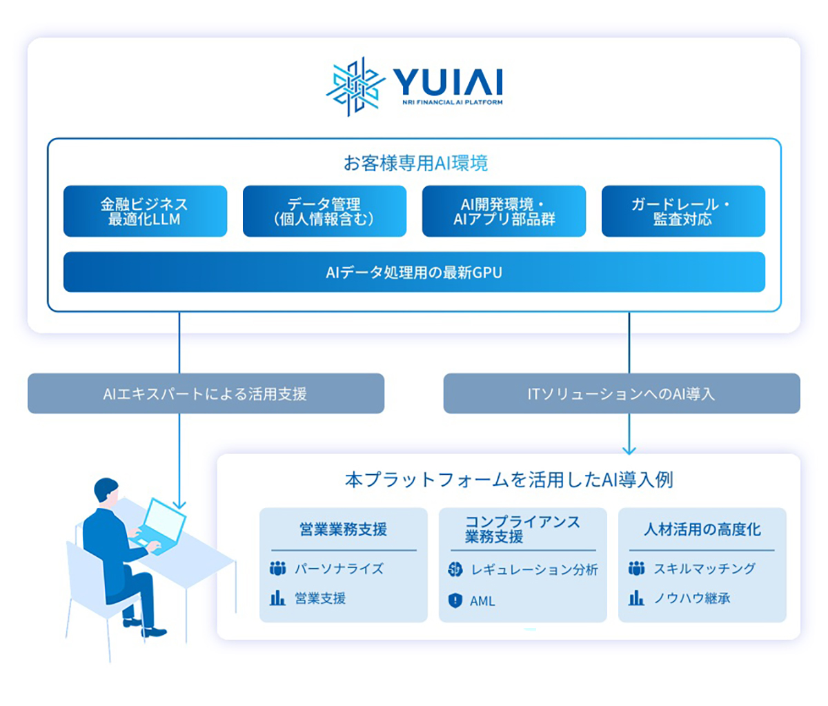 「YUIAI」は、野村総合研究所(NRI)が金融ビジネス向けに提供するAIプラットフォームサービスです。本サービスでは、NRIが保有する金融分野の知見やデータと、お客様が保有されている機微情報を含むデータを、安全性を確保しながら柔軟に生成AIと組み合わせてビジネスに活用することができます。
