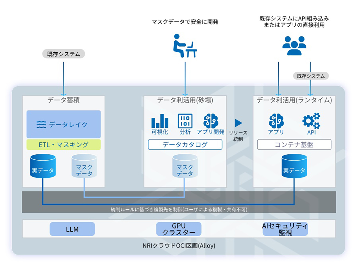 高度なセキュリティ、最新の技術を駆使したNRIのデータセンターにお客様ごとの専用環境を構築することで、AIによるデータ処理をデータセンター内で完結させます。これにより、データ主権を確保しつつ、堅牢な環境で柔軟にAIを利用することが可能です。
